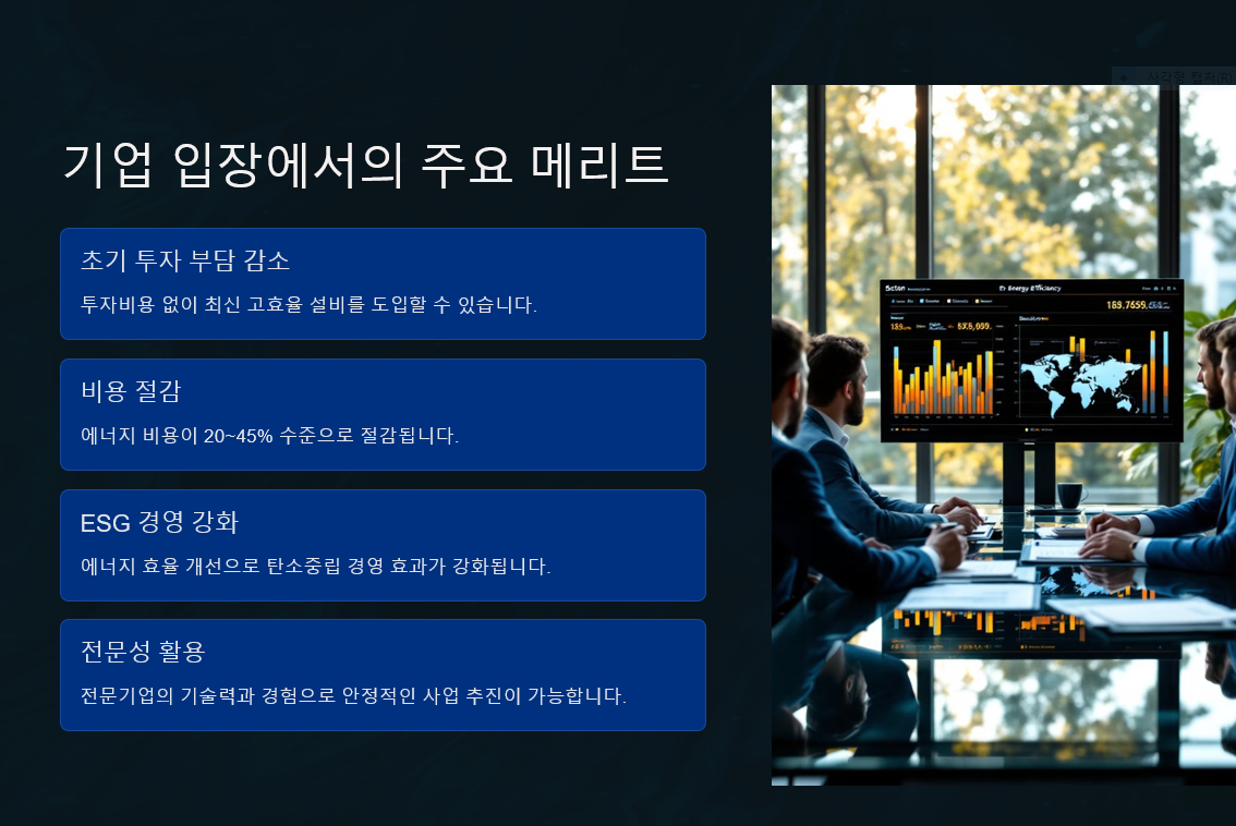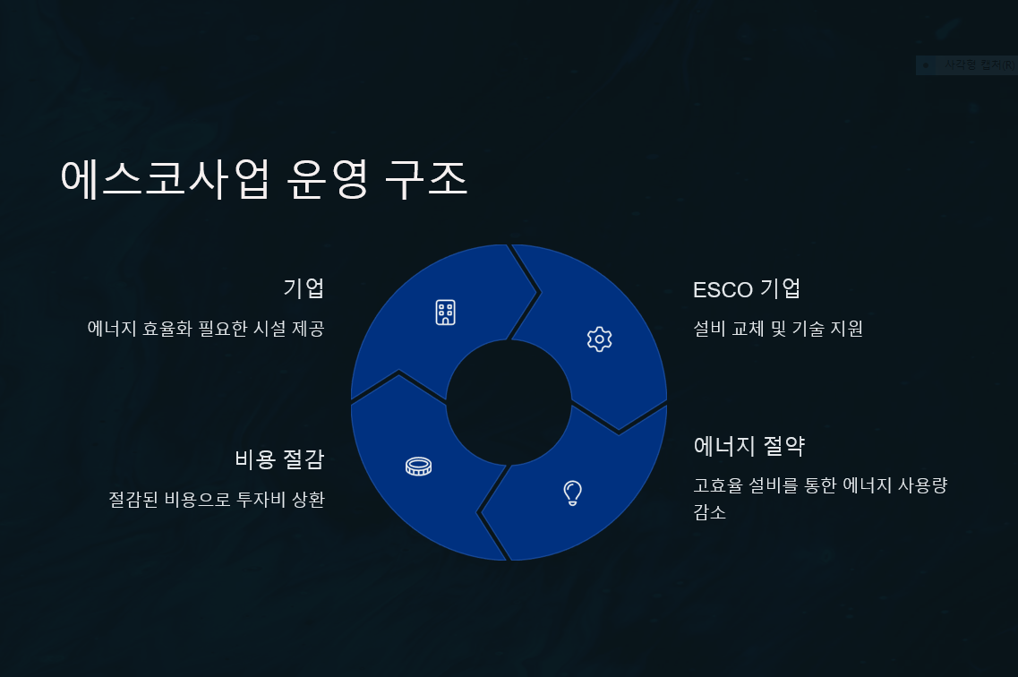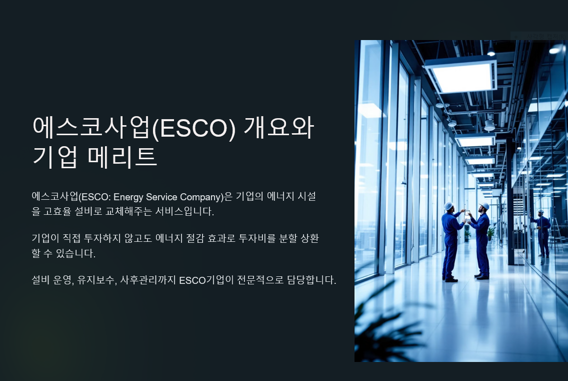 **에스코사업(ESCO)**는 기업이 에너지 관련 고효율 설비를 초기 투자 없이 도입하고,