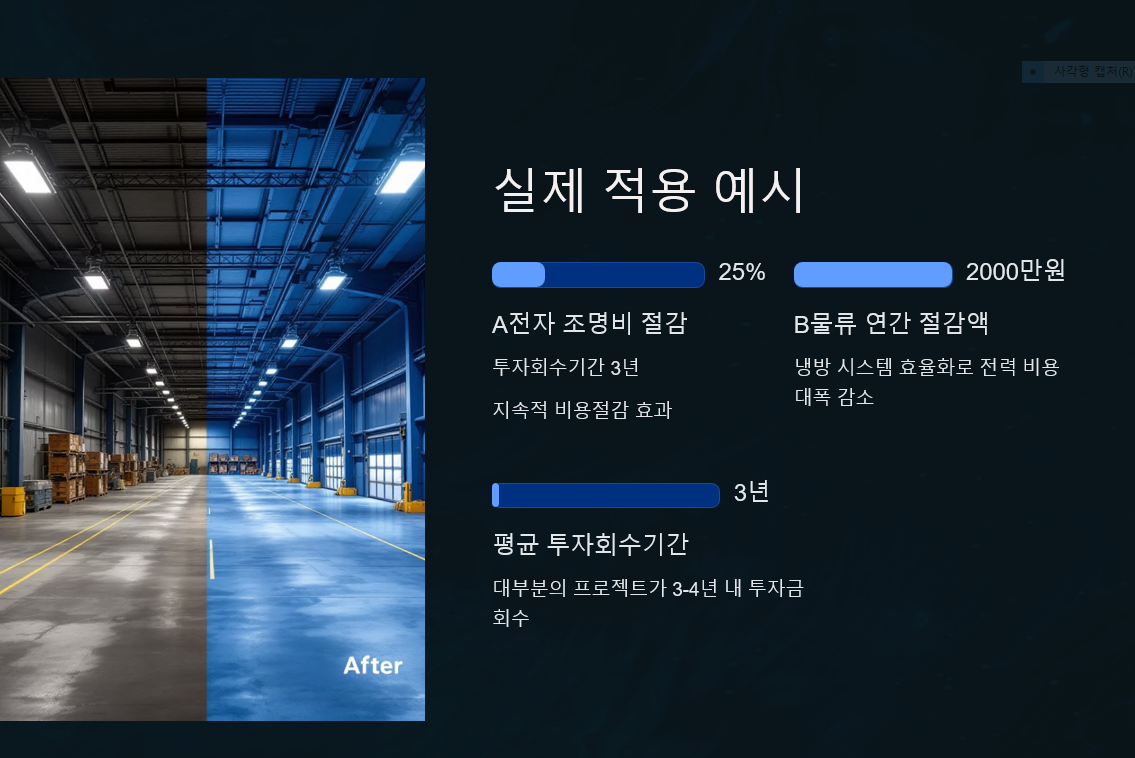 설비교체뿐만 아니라 태양광 발전사업, 스마트팩토리 솔루션, 정부지원사업 연계까지 원스톱으로 제공하니 믿을 수 있죠. 💼