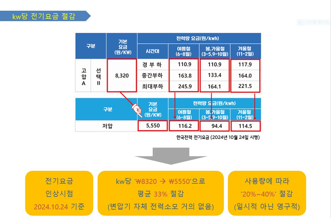- kw당 전력요금 8,320원 → 5,550원으로 33% 절감