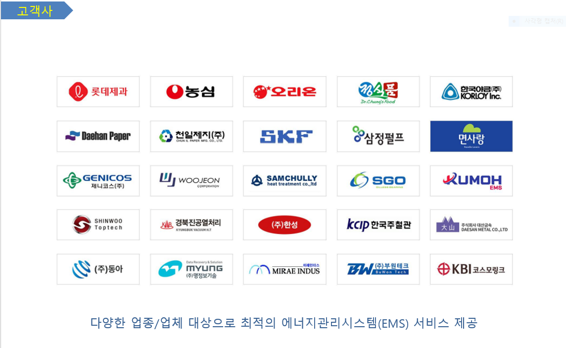 특히 스마트 생태공장 구축 사업에 참여하면서 아래와 같은 대표 고객사와 에너지 절감 프로젝트를 성공적으로 완료했어요: